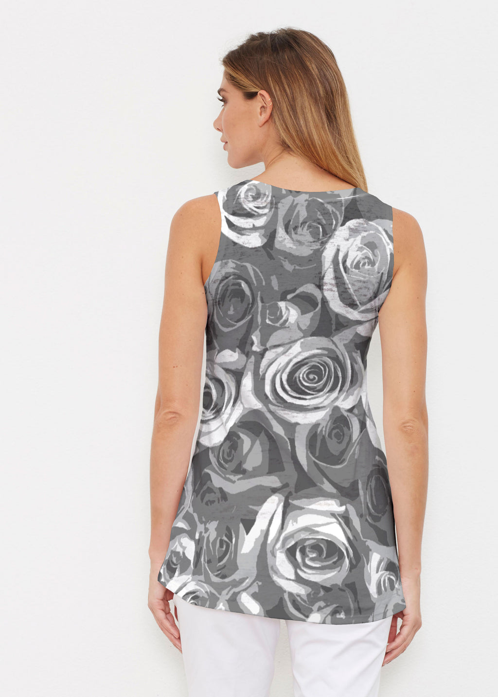 This tank is the perfect combination of an elegant shape with a sporty look. A high-low cascading hemline falls loosely over the hip in our Signature burnout fabric. No sleeves and a shallow scoop neckline give this tank its sporty vibe. -- Your one-of-a-kind garment is created using all-over soft garment sublimation printing. Selected designs are individually printed into your garment. Cotton/Polyester blend.