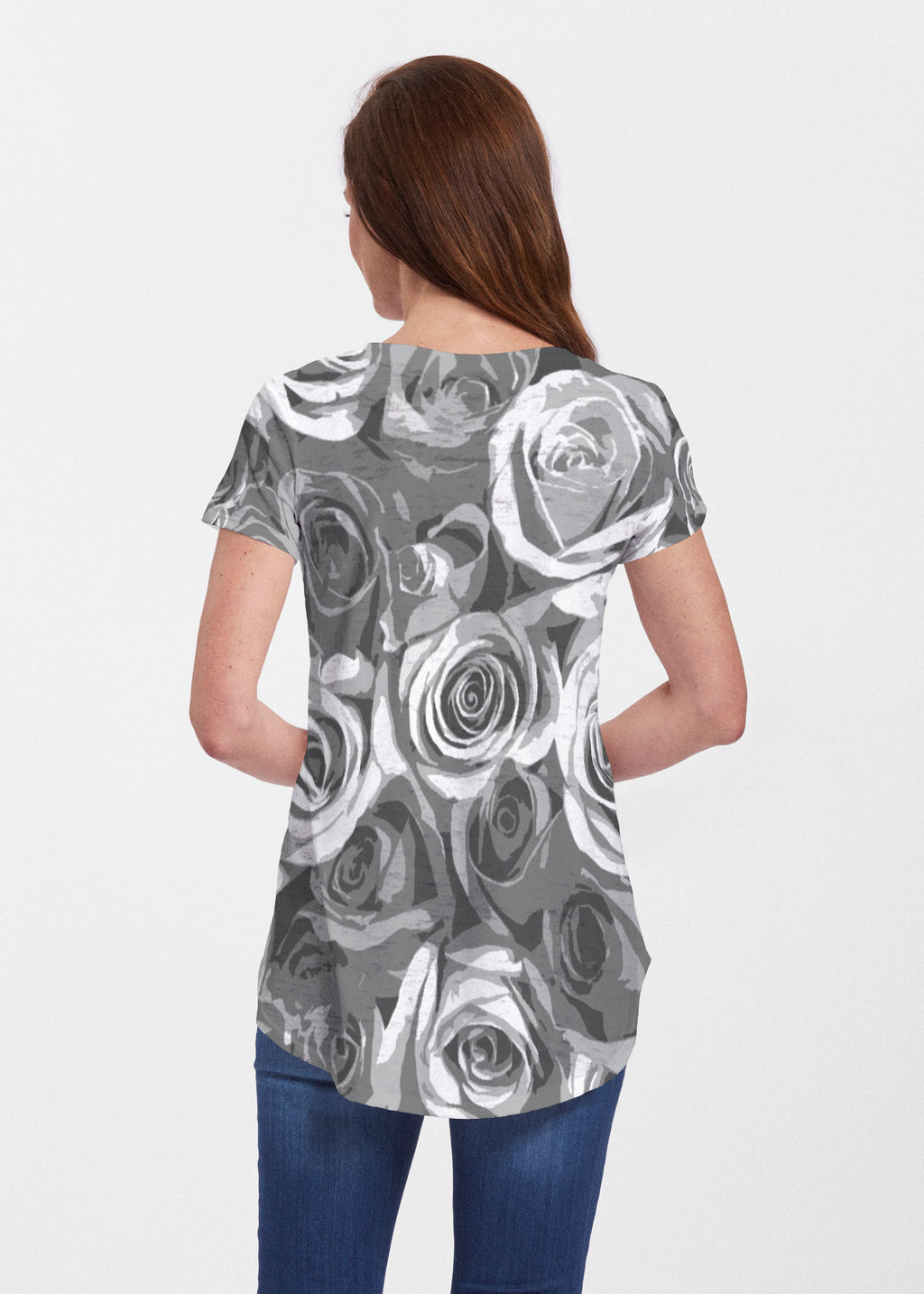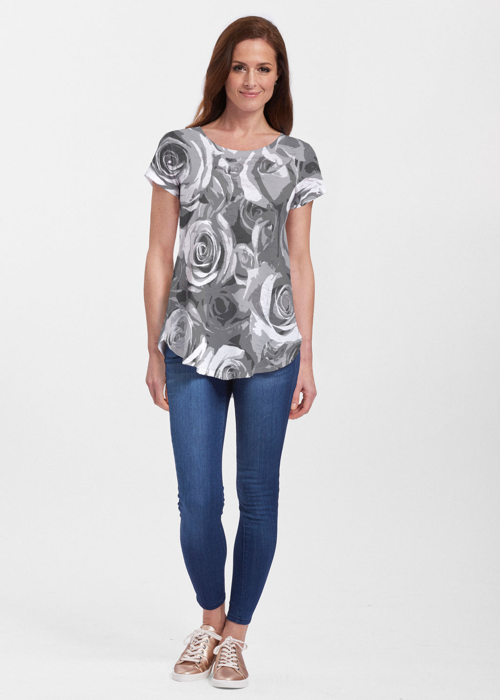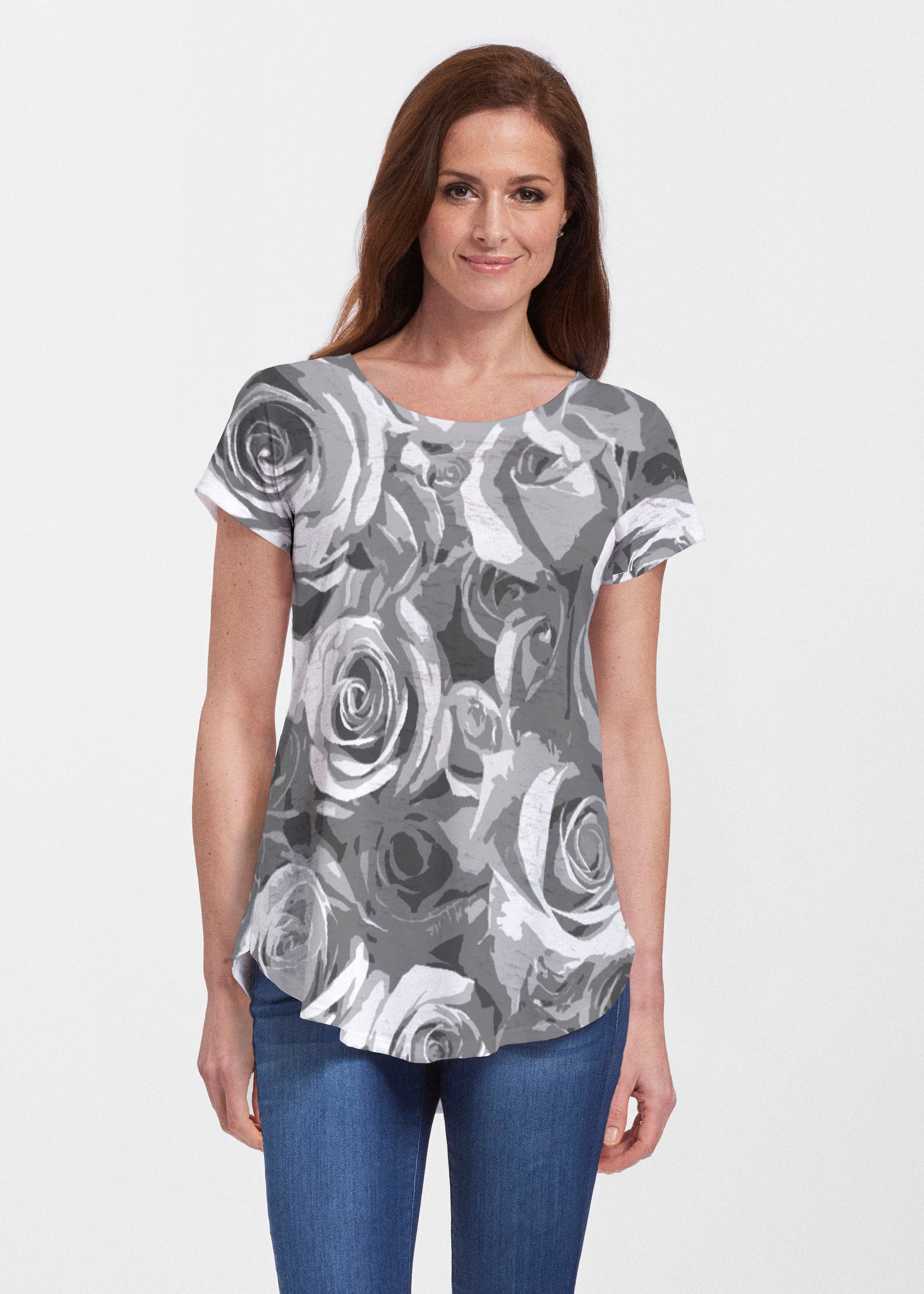 Versatile and fun, a striking rose print in shades of black, grey and white pairs with almost any wardrobe.