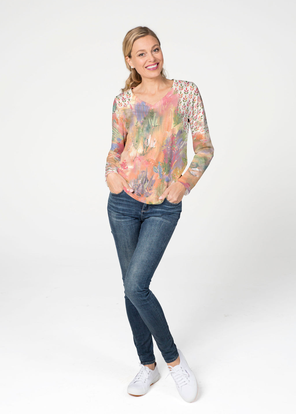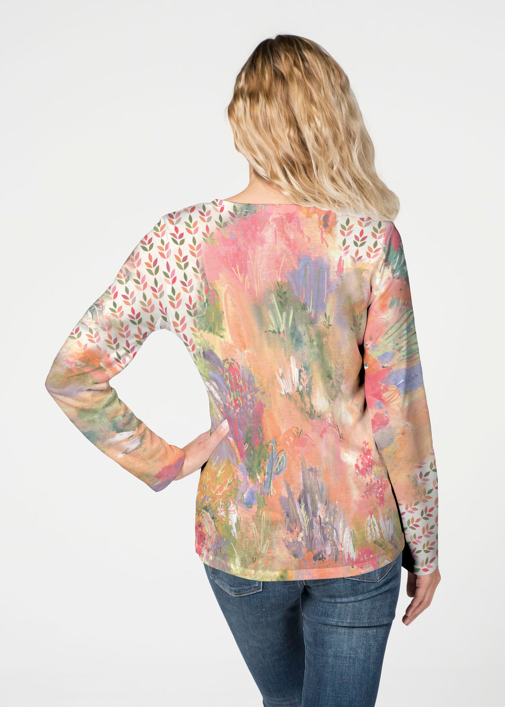 Warm autumn watercolors in oranges, greens, pinks and purples with pops of a small scale leafy print on shoulders and cuffs.
