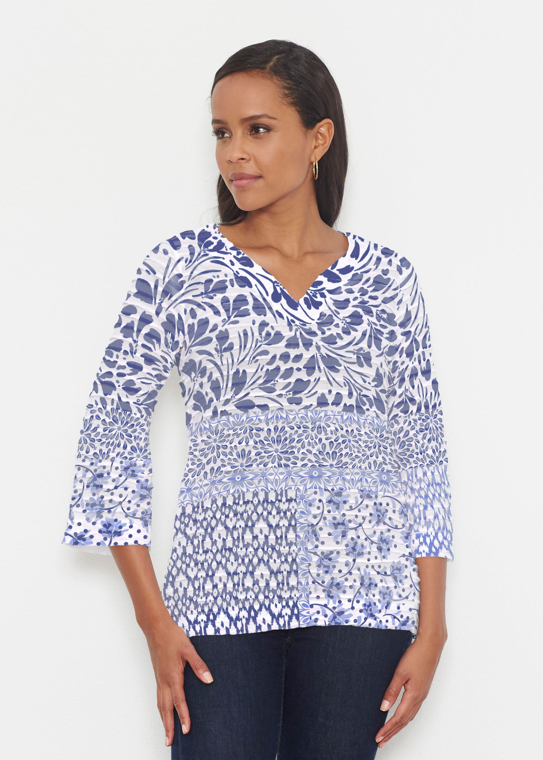 The uniquely soft, pleated texture in this Banded fabric give the 3/4 bell sleeves and sweetheart v-neck a fun and sophisticated look. Flattering side vents adorn the hemline that skims the hip.
