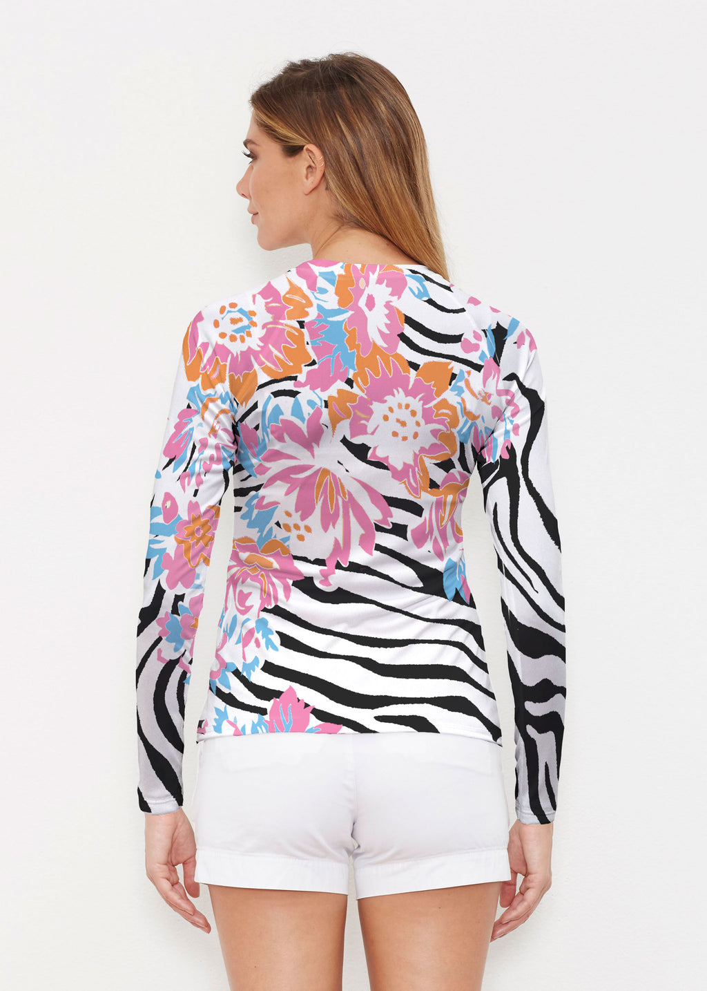 Our WHIMSY ROSE™ Safe Sun UPF 50+ long sleeve, crew neck rash guard offers versatile, beach-to-bistro style, supreme comfort, and an activewear fit. Made in a specially designed Safe Sun textile that blocks more harmful rays and provides a smart solution for those who love to swim, surf, kayak, canoe, waterski, boat, or simply relax waterside.