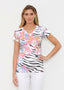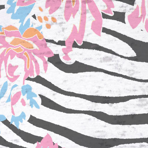A playful black and white zebra print with scattered pops of flowers in pink, orange & light blue.