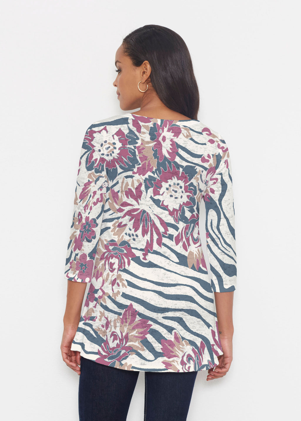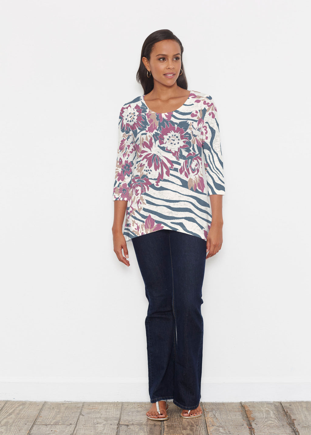An elegant fit, the hemline falls higher in front then cascades beautifully down across back. Delicate scoop neckline and 3/4 sleeves made in our soft Baby Waffle burnout thermal blend.