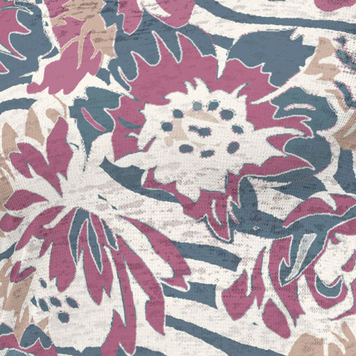 A playful navy and cream zebra print with scattered pops of flowers in burgundy, khaki & navy.